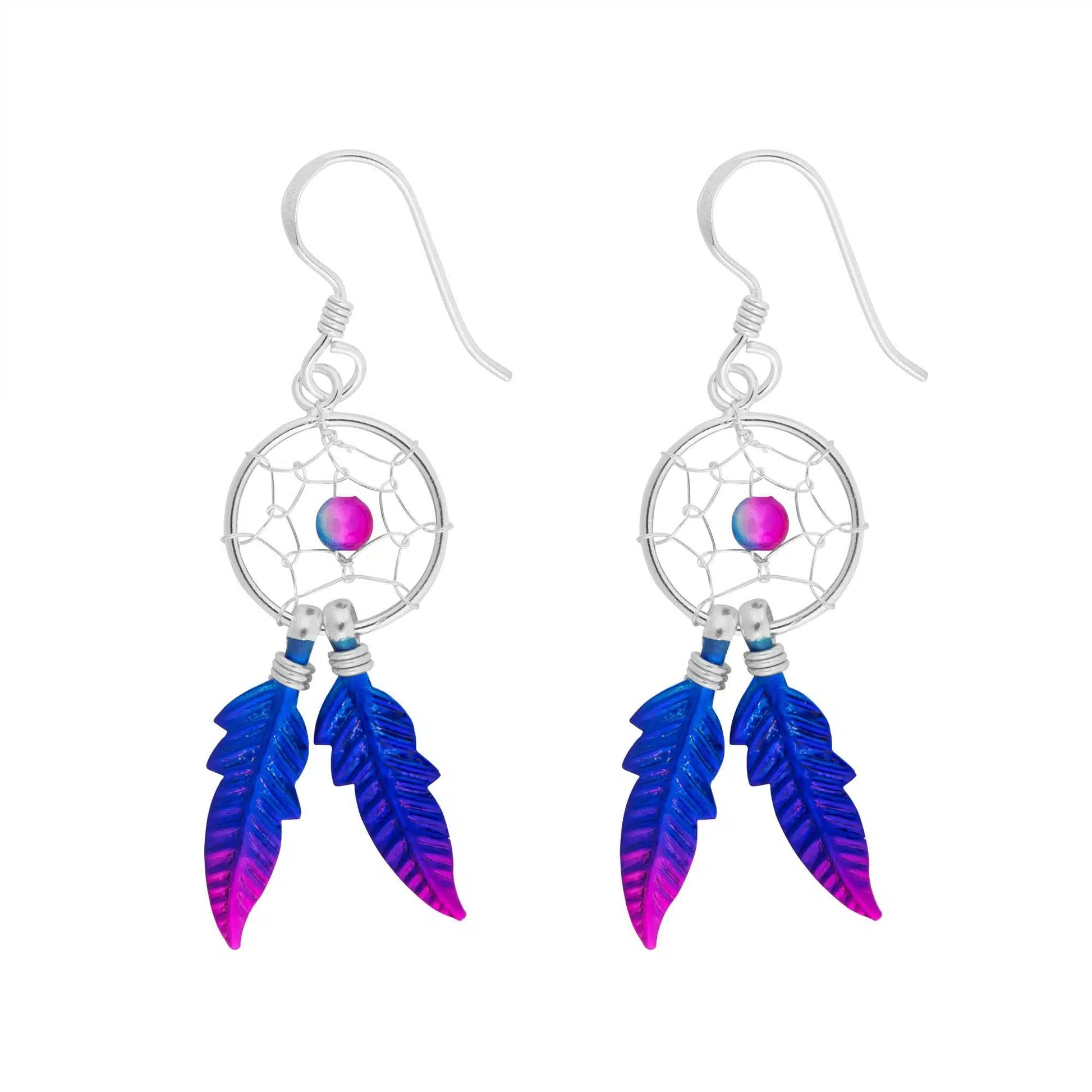 These beautiful, dainty Blue & Magenta Dreamcatcher earrings feature a lovely purple and magenta bead, along with two detailed silver feathers with a metallic purple fading to magenta finish. Polished to a high shine, they offer a stunning look. The earrings measure approximately 1.25cm by 4cm, including the hooks.